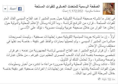 وأضاف بيان المتحدث عبر الصفحة الرسمية له على موقع التواصل الاجتماعي"فيسبوك " : "فى إطار ما نشرته صحيفة السياسة الكويتية حول حسم المشير عبد الفتاح السيسى القائد العام للقوات المسلحة ، قراره من الترشح للرئاسة ، وما أثارته وسائل الإعلام المحلية والدولية حول إعلان هذا القرار من خلال صحيفة عربية وليست مصرية ".