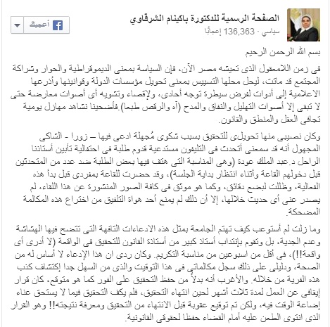 جدير بالذكر أن جامعة القاهرة قد أصدرت قرارا بوقف باكينام الشرقاوى عن العمل لمدة 3 أشهر؛ لحين انتهاء التحقيق معها في واقعة تحريض الطلاب على أعمال شغب داخل كلية الاقتصاد والعلوم السياسية في جامعة القاهرة، كما تقوم الجامعة بالتحقيق مع الدكتور سيف عبد الفتاح المستشار السابق للرئيس مرسي بتهمة الجمع بين وظيفتين، وتقاضى راتبين، دون أخذ إذن مسبق من الجامعة.