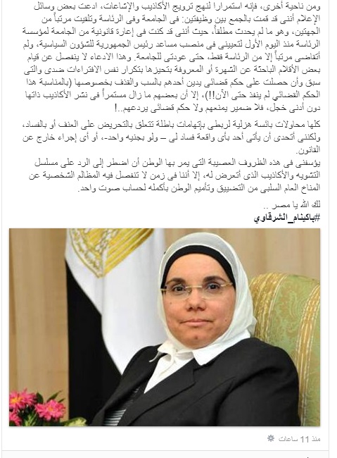 وقالت الشرقاوى "يؤسفنى فى هذه الظروف العصيبة التى يمر بها الوطن أن اضطر إلى الرد على مسلسل التشويه والأكاذيب الذى أتعرض له، إلا أننا في زمن لا تنفصل فيه المظالم الشخصية عن المناخ العام السلبى من التضييق وتأميم الوطن بأكمله لحساب صوت واحد، لك الله يا مصر ".