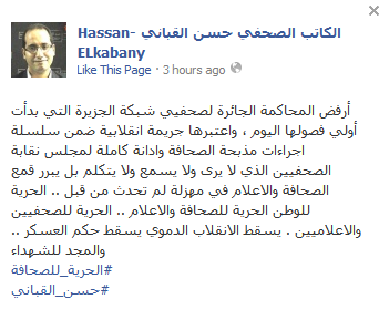 أعرب اليوم حسن القباني المتحدث الإعلامي بإسم "صحفيون من أجل الإصلاح" فى بيان له عن رفضة التام للمحاكمة الجائرة لصحفيي شبكة الجزيرة التي بدأت أولي فصولها اليوم ، واعتبرها جريمة انقلابية ضمن سلسلة اجراءات لمذبحة الصحافة .