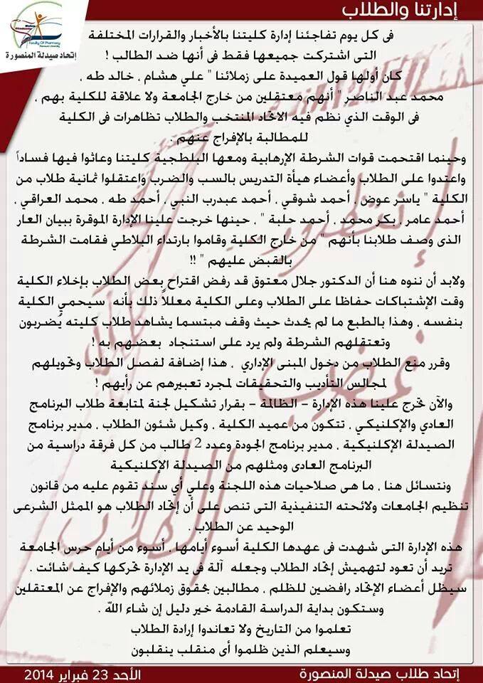 أصدر اليوم إتحاد طلاب صيدلة جامعة المنصورة بيانا إستهجنوا فيه ممارسات إدارة الجامعة والقائمين عليها من فرض الظلم  والتعسف على طلاب الجامعة , وتهميشهم, وقرارات فصل ومجالس تأديب بتهمة إبداء الرأي والتعبير عن وجهة نظرهم .
