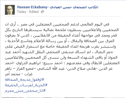 "لم أنسى صديقي الصحفي البطل الشهيد أحمد عبد الجواد أو باقي الشهداء التسعة ولن ننسى كل الصحفيين والاعلاميين المعتقلين الأبطال وفي مقدمتهم : احمد سبيع- ابراهيم الدراوي -احمد عز الدين -هاني صلاح الدين- عبد الله الشامي –عمرو القزاز – باهر غراب – محمد آمر"