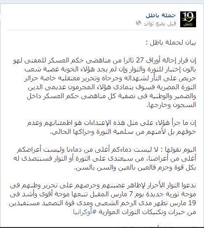 كان ذلك كرد فعل على قرار إحالة أوراق 27 من مناهضى حكم العسكر للمفتى ، حيث أكدوا أنه "يعد بالون إختبار للثورة والثوار ، فإن لم يجد هؤلاء الخونة غضبة شعب حريص على الثأر لشهدائه وجرحاه وتحرير معتقليه خاصة حرائر الثورة المصرية فسوف يتمادى هؤلاء المجرمون عديمى الدين والضمير والوطنية فى تصفية كل مناهضى حكم العسكر داخل السجون وخارجها".