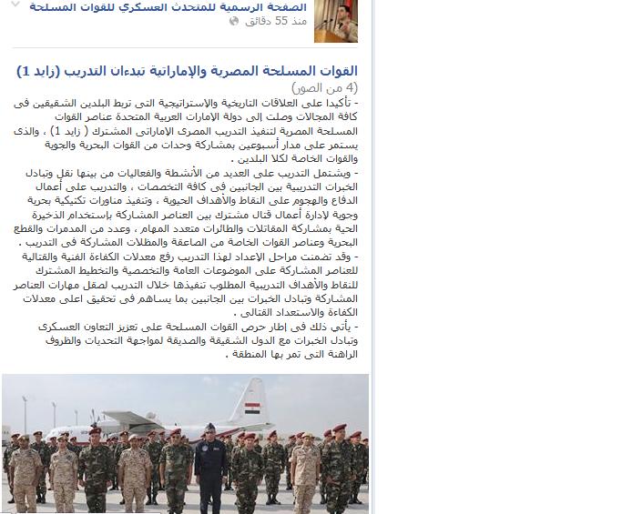قال العقيد أركان حرب أحمد على المتحدث العسكرى للقوات المسلحة إن القوات المصرية المصرية المشاركة فى التدريب المصرى الإماراتى المشترك ( زايد 1) ،وصلت الإمارات، مضيفا أن (زايد 1) يستمر على مدار أسبوعين بمشاركة وحدات من القوات البحرية والجوية والقوات الخاصة لكلا البلدين .