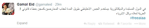 وأضاف عيد فى تغريدة عبر حسابه الرسمى على "تويتر" :" في الدول المستبدة والديكتاتورية ،يستخدم الحبس الاحتياطي طويل المدة لعقاب المعارضين، كسجن بغطاء قانوني !. الحرية لعلاء وكل الأبرياء".