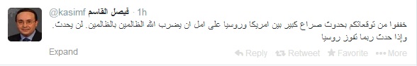 وأضاف القاسم عبر حسابه الرسمى على "تويتر" :" خففوا من توقعاتكم بحدوث صراع كبير بين أمريكا وروسيا على أمل أن يضرب الله الظالمين بالظالمين. لن يحدث. وإذا حدث ربما تفوز روسيا".