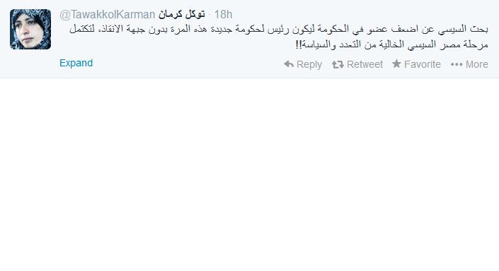 وقالت كرمان عبر حسبها الرسمى على "تويتر" :" بحث السيسي عن اضعف عضو في الحكومة ليكون رئيس لحكومة جديدة هذه المرة بدون جبهة الإنقاذ، لتكتمل مرحلة مصر السيسي الخالية من التعدد والسياسة!!"