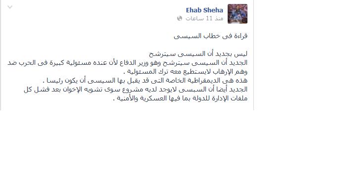 وقال – عبر حسابه الرسمي على موقع التواصل الاجتماعى "فيس بوك" :"ليس بجديد أن السيسي سيترشح للرئاسة، وإنما الجديد أن السيسي سيترشح، وهو وزير الدفاع؛ ﻷن عنده مسئولية كبيرة في الحرب ضد وهم الإرهاب لا يستطيع معه ترك المسئولية" .