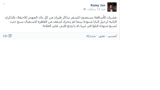 وقال عبر حسابه الرسمي على موقع التواصل الاجتماعي "فيس بوك": "ﻋﺸﺮﺍﺕ ﺍﻟأﺳﺎﻗﻔﺔ ﻳﺴﺘﻌﺪﻭﻥ ﻟﻠﺴﻔﺮ ﺑﺘذﺍﻛﺮ ﻃﻴﺮﺍﻥ ﻣﻦ ﻛﻞ ﺑلاﺩ ﺍﻟﻤﻬﺠﺮ ﻟﻠاﺣﺘﻔﺎل ﺑﺎﻟﺬﻛﺮﻱ ﺍﻟﺜﺎﻧﻴﻪ ﻟﺮﺣﻴﻞ ﺍﻟﺒﺎﺑﺎ ﺷﻨﻮﺩﺓ، ﺑﻴﻨﻤﺎ ﻟﻢ ﻳﺘﺤﺮﻙ أﺳﻘﻒ ﻣﻦ ﺍﻟﻘﺎﻫﺮﺓ ﻟﺎﺳﺘﻘﺒﺎﻝ ﺳﺒﻊ ﺟﺜﺚ ﻟﺴﺒﻊ ﺷﻬﺪﺍﺀ ﻗﺘﻠﻮﺍ في ﻟﻴﺒﻴﺎ".