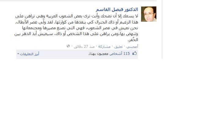 وقال – عبر صفحته الرسمية على موقع التواصل الاجتماعي "فيس بوك" -: "لا يسعك إلا أن تضحك، وأنت ترى بعض الشعوب العربية، وهي تراهن على هذا الزعيم أو ذاك الجنرال كي ينقذها من كوارثها".