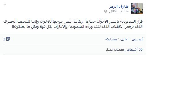 وقال الزمر عبر حسابه الشخصى على موقع التواصل الاجتماعي "فيس بوك" – :"قرار السعودية باعتبار الإخوان جماعة إرهابية ليس موجها للإخوان وإنما للشعب المصرى الذى يرفض الانقلاب الذى تقف وراءه السعودية والإمارات بكل قوة وبكل ما يملكون!!".