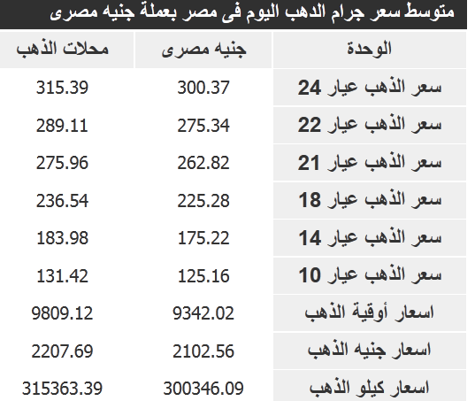 والجدول التالى يوضح أسعار عيارات الذهب
