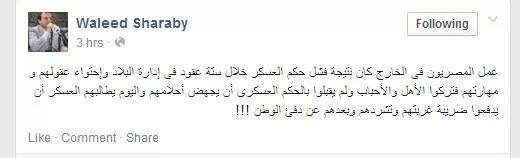 وأضاف شرابي في تدوينة على صفحته الشخصية على موقع التواصل الاجتماعي "فيس بوك" أن "الحكم العسكري يجهض أحلام المصريين اليوم ويطالبهم بأن يدفعوا ضريبة غربتهم وتشردهم وبعدهم عن دفء الوطن".