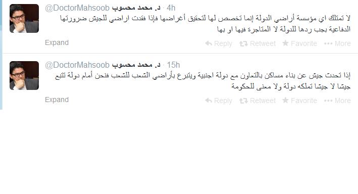 وقال محسوب عبر حسابه الشخصى على موقع التواصل الاجتماعى "تويتر" :"إذا تحدث جيش عن بناء مساكن بالتعاون مع دولة أجنبية ويتبرع بأراضي الشعب للشعب فنحن أمام دولة تتبع جيشا لا جيشا تملكه دولة ولا معنى للحكومة".