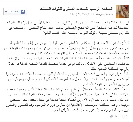 نفت القوات المسلحة ما نشرته صحيفة "المصرى اليوم" فى صدر صفحتها الأولى حول إشراف الهيئة الهندسية للقوات المسلحة على البرنامج الانتخابي للمشير عبد الفتاح السيسى قائد الانقلاب العسكري ، واستندت فى ذلك إلى مصادر مجهلة.