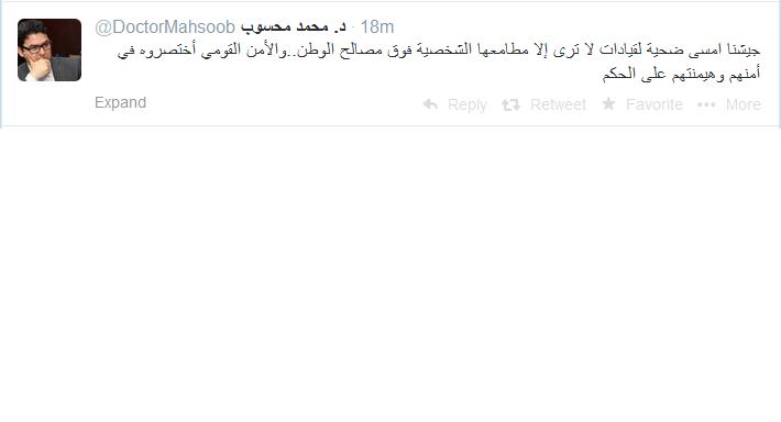 وقال عبر حسابه الرسمي على موقع التواصل الاجتماعي "تويتر": "جيشنا أمسى ضحية لقيادات لا ترى إلا مطامعها الشخصية فوق مصالح الوطن .. والأمن القومي اختصروه في أمنهم وهيمنتهم على الحكم".