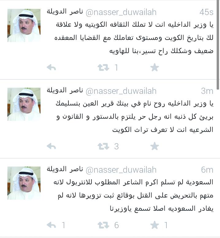 ووجه نداءا إلى وزير داخلية الكويت قائلا أن "السعودية لم تسلم أكرم الشاعر المطلوب للانتربول لأنه متهم بالتحريض على القتل بوقائع ثبت تزويرها فهو لم يغادر السعودية اصلا فهل تسمع ياوزيرنا".