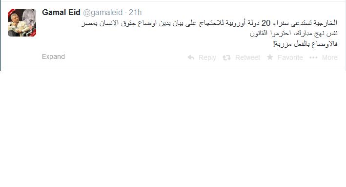 وقال عبر حسابه الرسمي على موقع التواصل الاجتماعي "تويتر": " الخارجية تستدعي سفراء 20 دولة أوروبية للاحتجاج على بيان يدين أوضاع حقوق الإنسان بمصر نفس نهج مبارك، احترموا القانون فالأوضاع بالفعل مزرية!".