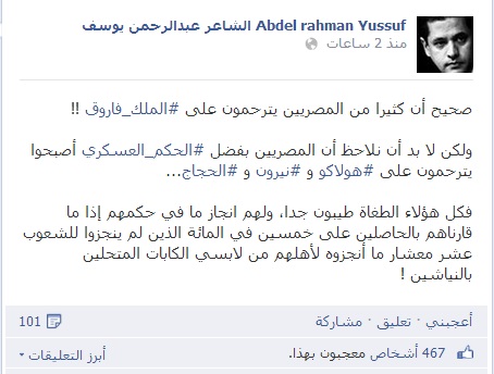 وقال عبر صفحته الرسمية على موقع التواصل الاجتماعى "فيس بوك" :" صحيح أن كثيرا من المصريين يترحمون على الملك فاروق، ولكن لا بد أن نلاحظ أن المصريين بفضل الحكم العسكري أصبحوا يترحمون على هولاكو و نيرون و الحجاج.