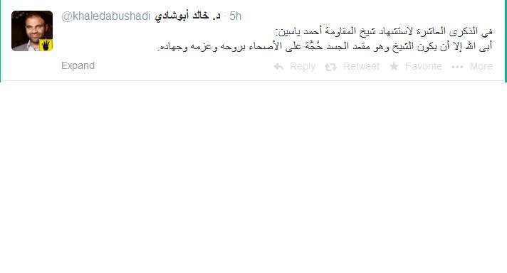 وأضاف أبو شادى عبر حسابه الشخصى على موقع التواصل الاجتماعى " تويتر " : " في الذكرى العاشرة لاستشهاد شيخ المقاومة أحمد ياسين: أبى الله إلا أن يكون الشيخ وهو مقعد الجسد حُجَّة على الأصحاء بروحه وعزمه وجهاده".