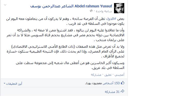 وأضاف عبر صفحته الشخصية على موقع التواصل الاجتماعي " فيس بوك " : "بعض الدول تظن أن الفرصة سانحة ، وهم لا يدركون أن من يتعاملون معه اليوم لن يكون موجودا في السلطة في غد قريب ، وأن ما تعاقدوا عليه اليوم لن ينالوه ، فقد اشتروا ممن لا صفة له ، والشراكة الاقتصادية بين دولة بحجم مصر في مشاريع بحجم قناة السويس مثلا لا بد أن تمر على برلمان منتخب ".