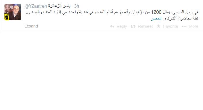 وقال عبر صفحته الشخصية على موقع التواصل الاجتماعى " تويتر" :" في زمن السيسي، يمثل 1200 من الإخوان وأنصارهم أمام القضاء في قضية واحدة هي إثارة العنف والفوضى. قتلة يحاكمون الشرفاء".