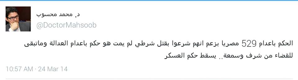 ووصف محسوب على صفحتة الرسمية على موقع التواصل الاجتماعى "توتير" حكم اليوم "بإعدام العدالة وماتبقى للقضاء من شرف وسمعة " مناديًا بسقوط العسكر" يسقط حكم العسكر".