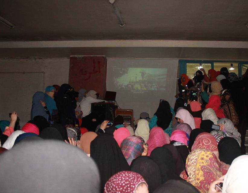نظمت طالبات ‫الأزهر‬ مساء اليوم عرضاً سينمائياً داخل المدينة الجامعية للطالبات ، عرضن فيه مقاطع فيديو ، لإنتهاكات قوات الانقلاب التي تمت بحقهن داخل الجامعة والمدينة خلال الفصل الدراسي الأول من إعتقالات وإطلاق لقنابل الغاز والخرطوش .