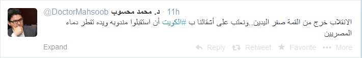 وقال محسوب عبر حسابه الشخصي على موقع التواصل الاجتماعي "تويتر" : " الانقلاب خرج من القمة صفر اليدين … ونعتب على أشقائنا بالكويت أن استقبلوا مندوبه ويده تقطر دماء المصريين".