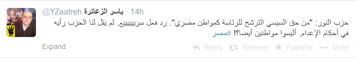 وقال الزعاترة عبر حسابه الشخصى على موقع التواصل الاجتماعى "تويتر" :" حزب النور: "من حق السيسي الترشح للرئاسة كمواطن مصري". رد فعل سرييييييع. لم يقل لنا الحزب رأيه في أحكام الإعدام. أليسوا مواطنين أيضا؟!"