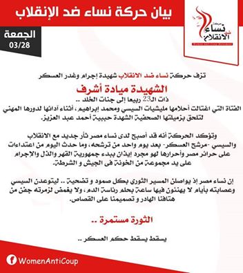 أكدت حركة “نساء ضد الانقلاب” أن اليوم هو بداية ثأر جديد لدى نساء مصر مع قائد الانقلاب العسكري عبدالفتاح السيسي بعد يوم واحد من ترشحه ، وجاء ذلك تعليقا على إستشهاد مراسلة موقع “مصر العربية” إثر اعتداء أمن الانقلاب وبلطجية على تظاهرة عين شمس الإحتجاجية اليوم .