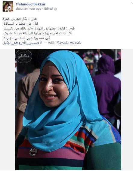 وقال محمود بكار -المصور الصحفي الذي التقط الصورة ونشرها على صفحتها الشخصية بعد مقتلها-:"هى : بكار صورنى صورة انا : من عونيا يا استاذة هى : ابقى ابعتهالى انهارة وخد بالك من نفسك دى كانت اخر صورة صورتها للزميلة ميادة اشرف فى مسيرة عين شمس انهاردة #حسبى_الله_ونعم_الوكيل ".