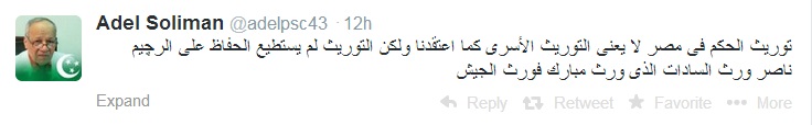 وقال عبر حسابه الشخصى على موقع التواصل الاجتماعى "تويتر" :" توريث الحكم فى مصر لا يعنى التوريث الأسرى كما اعتقدنا ولكن التوريث لم يستطيع الحفاظ على الرچيم ناصر ورث السادات الذى ورث مبارك فورث الجيش".