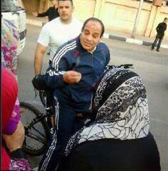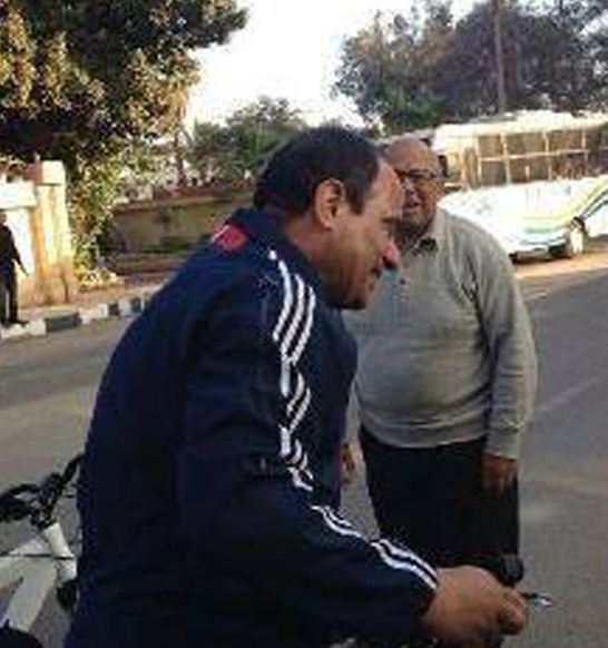 تداول مجموعة من النشطاء على مواقع التواصل الإجتماعي صور قائد الانقلاب العسكري " عبدالفتاح للسيسى" بالزى الرياضى ، وهو يركب "عجلة" ، ويخاطب مجموعة من المارة.