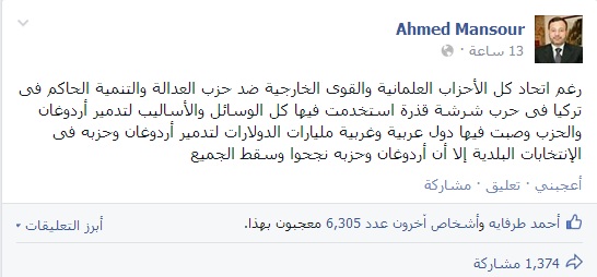 وقال عبر صفحته الرسمية على موقع التواصل الاجتماعى "فيس بوك" :" رغم اتحاد كل الأحزاب العلمانية والقوى الخارجية ضد حزب العدالة والتنمية الحاكم فى تركيا فى حرب شرشة قذرة ، استخدمت فيها كل الوسائل والأساليب لتدمير أردوغان والحزب وصبت فيها دول عربية وغربية مليارات الدولارات ، لتدمير أردوغان وحزبه فى الانتخابات البلدية إلا أن أردوغان وحزبه نجحوا وسقط الجميع".