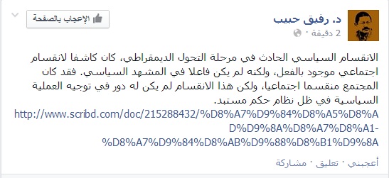 وقال حبيب عبر صفحته الشخصية على موقع التواصل الاجتماعي "فيس بوك" :" الانقسام السياسي الحادث في مرحلة التحول الديمقراطي، كان كاشفا لانقسام اجتماعي موجود بالفعل، ولكنه لم يكن فاعلا في المشهد السياسي. فقد كان المجتمع منقسما اجتماعيا، ولكن هذا الانقسام لم يكن له دور في توجيه العملية السياسية في ظل نظام حكم مستبد".
