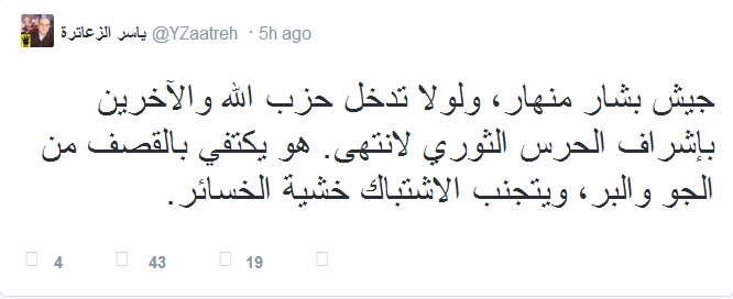 وأضاف الزعاترة عبر حسابه الشخصى على موقع التواصل الاجتماعي "تويتر" :" جيش بشار منهار، ولولا تدخل حزب الله والآخرين بإشراف الحرس الثوري لانتهى. هو يكتفي بالقصف من الجو والبر، ويتجنب الاشتباك خشية الخسائر".