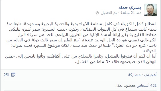 وقال عبر حسابه الشخصى على موقع التواصل الاجتماعى "فيس بوك" :" انقطاع كامل للكهرباء في كامل منطقة الإبراهيمية والحضرة البحرية وسموحة، طبعًا منذ سنة كانت ستذاع في كل القنوات الفضائية، ويكون حديث السهرة: مصر كبيرة عليكم".