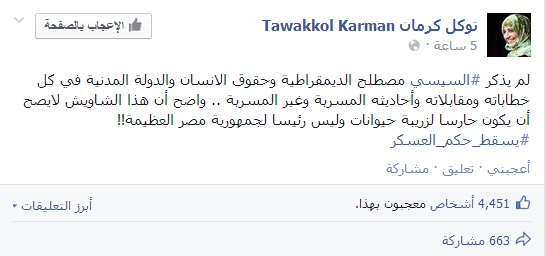 هاجمت توكل كرمان – الناشطة الحقوقية اليمنية – قائد الانقلاب العسكرى "عبد الفتاح السيسى" ؛ مؤكدة أنه لم يتحدث مطلقا عن الديمقراطية وحقوق الانسان والدولة المدنية.