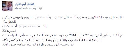 "تم القبض على أخي محمد مجدي أحمد كمال ، ذا الـ 23 ربيعا يوم 22 فبراير  دون وجه حق ، وتم التحقيق معه بأمن الدولة ، حيث تم الاعتداء عليه بالضرب والتعذيب ، و رشه بالمبيدات الحشرية و كسر فكه ، وقد تم ترحيله إلى سجن طرة و لم يتم علاجه حتى الآن".