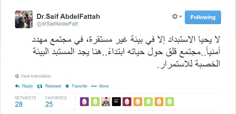 وقال عبد الفتاح عبر حسابه الشخصي على موقع التواصل الاجتماعي "تويتر" : " لا يحيا الاستبداد إلا في بيئة غير مستقرة، في مجتمع مهدد أمنياً..مجتمع قلق حول حياته ابتداءً..هنا يجد المستبد البيئة الخصبة للاستمرار".