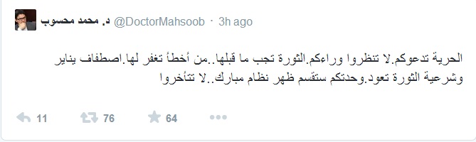 وقال عبر حسابه الرسمي على موقع التواصل الاجتماعي "تويتر" : "الحرية تدعوكم .. لا تنظروا وراءكم .. الثورة تجب ما قبلها..من أخطأ تغفر له.. اصطفاف يناير وشرعية الثورة تعود..وحدتكم ستقصم ظهر نظام مبارك..لا تتأخروا".