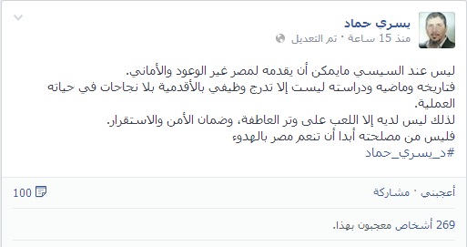 وقال عبر حسابه الرسمي على موقع التواصل الاجتماعي " فيس بوك" :" ليس عند السيسي ما يمكن أن يقدمه لمصر غير الوعود والأمانيفتاريخه وماضيه ودراسته ليست إلا تدرج وظيفي بالأقدمية بلا نجاحات في حياته العملية"