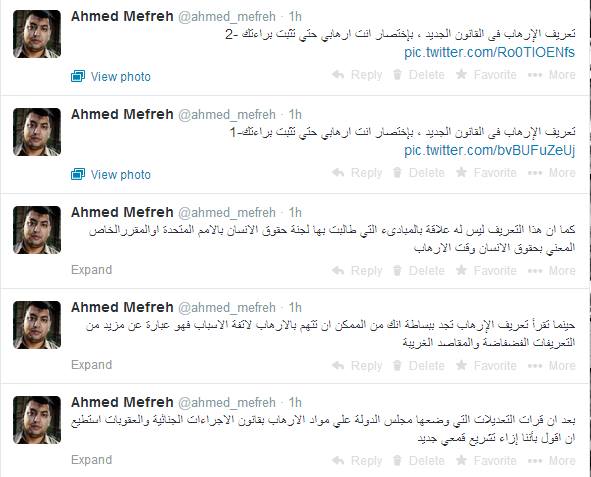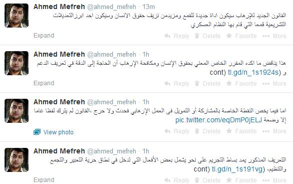 ونشر عبر حسابه الشخصى على موقع التواصل الاجتماعى "تويتر" عدة تويتات يشرح من خلالها الكوارث الناتجة عن إقرار قانون الارهاب من قبل حكومة الانقلاب ، ذكر فيها :