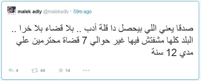 وقال عبر حسابه الشخصى على موقع التواصل الاجتماعى "تويتر" : " صدقا يعني اللي بيحصل دا قلة أدب .. بلا قضاء بلا خرا .. البلد كلها مشفتش فيها غير حوالي 7 قضاة محترمين علي مدي 12 سنة".