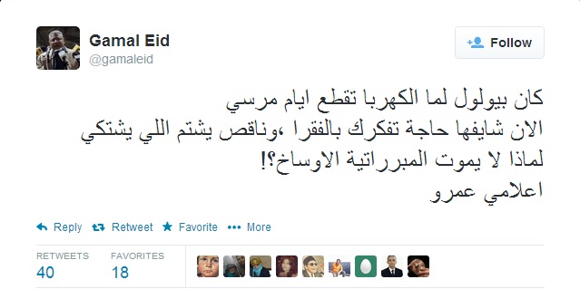 وقال عبر حسابه الشخصى على موقع التواصل الاجتماعى "تويتر" :" كان بيولول لما الكهربا تقطع ايام مرسي الان شايفها حاجة تفكرك بالفقرا، وناقص يشتم اللي يشتكي لماذا لا يموت المبرراتية الاوساخ؟! إعلامي عمرو".