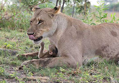 بالصور..أنثى أسد ترعى قرد رضيع بعد مقتل أمه