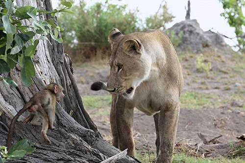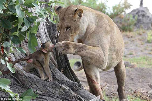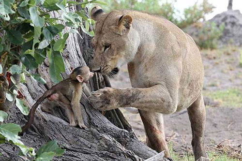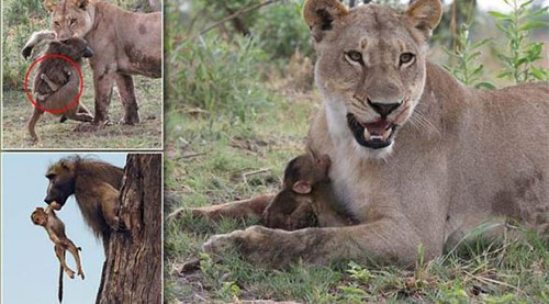 وتم ذلك خلال بحديقة في بوتسوانا الأفريقية حيث  سارعت إلى احتضانه في محاولة لمنحه الأمان  وتصارعت مع الاسود زملائها رافضة ان يتم تناول الرضيعحتى ساعدته للصعود على الشجرة والانضمام لباقي القرود .