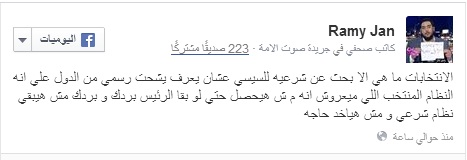 وقال جان عبر صفحته الرسمية على موقع التواصل الاجتماعي "فيس بوك": "الانتخابات ما هي إلا بحث عن شرعية للسيسي عشان يعرف يشحت رسمي من الدول على إنه النظام المنتخب اللي ميعرفوش انه مش هيحصل حتى لو بقا الرئيس بردك و بردك مش هيبقي نظام شرعي، ومش هياخد حاجه".