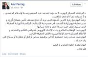 وأضاف فراج على صفحته الشخصية على موقع التواصل الاجتماعي "فيس بوك " "أن ذلك يأتي تزامنا مع زيارة مفوضة العلاقات الخارجية كاثرين أشتون لمصر حتى تطمئن على مرور مسرحية الانتخابات الهزلية .